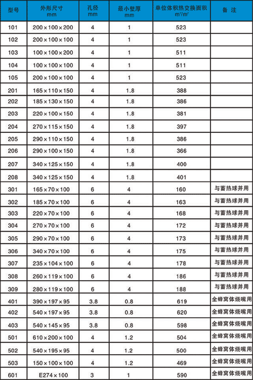 蓄热式燃烧方式是近年来发展的工业炉节能和环保新技术。蓄热体是实现此项新柱术的关键配件材料。它是按照蜂窝结构排列蓄热体孔洞的,为了充分发挥蓄热体孔洞的效率,孔洞设计成圆形。由于采取浇注成型工艺,蓄热体的原材料级配合理,热稳定性好,适合制作各种异形制品。并且可以做成大型制品,专利号:ZL00219582.8(尺寸可达610x 200x 10Omm和274~lOOmm)根据孔径、单位体积的换热面积以及外形尺寸,我公司已经生产的蓄热体可以大致分为下列品种规格。 |